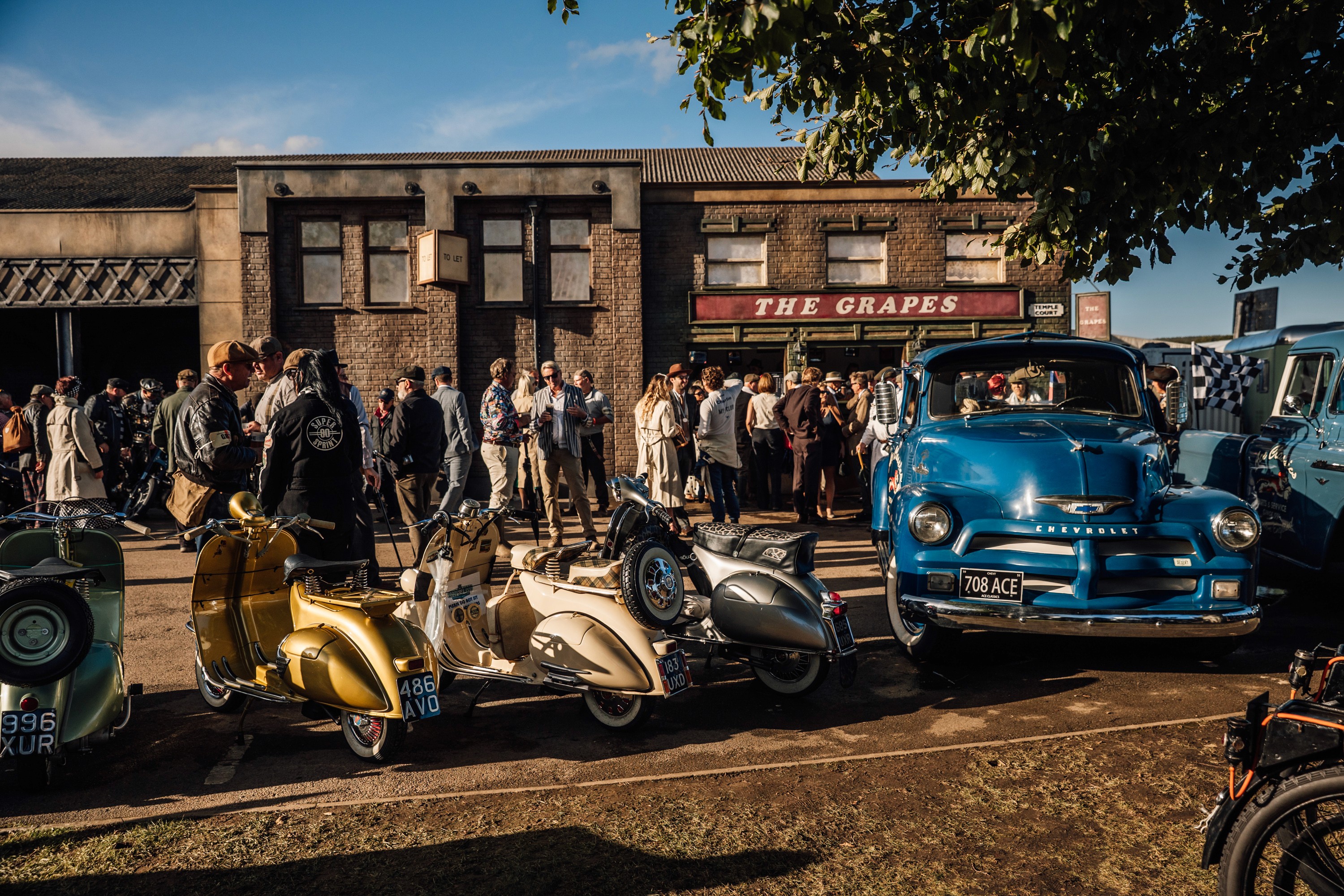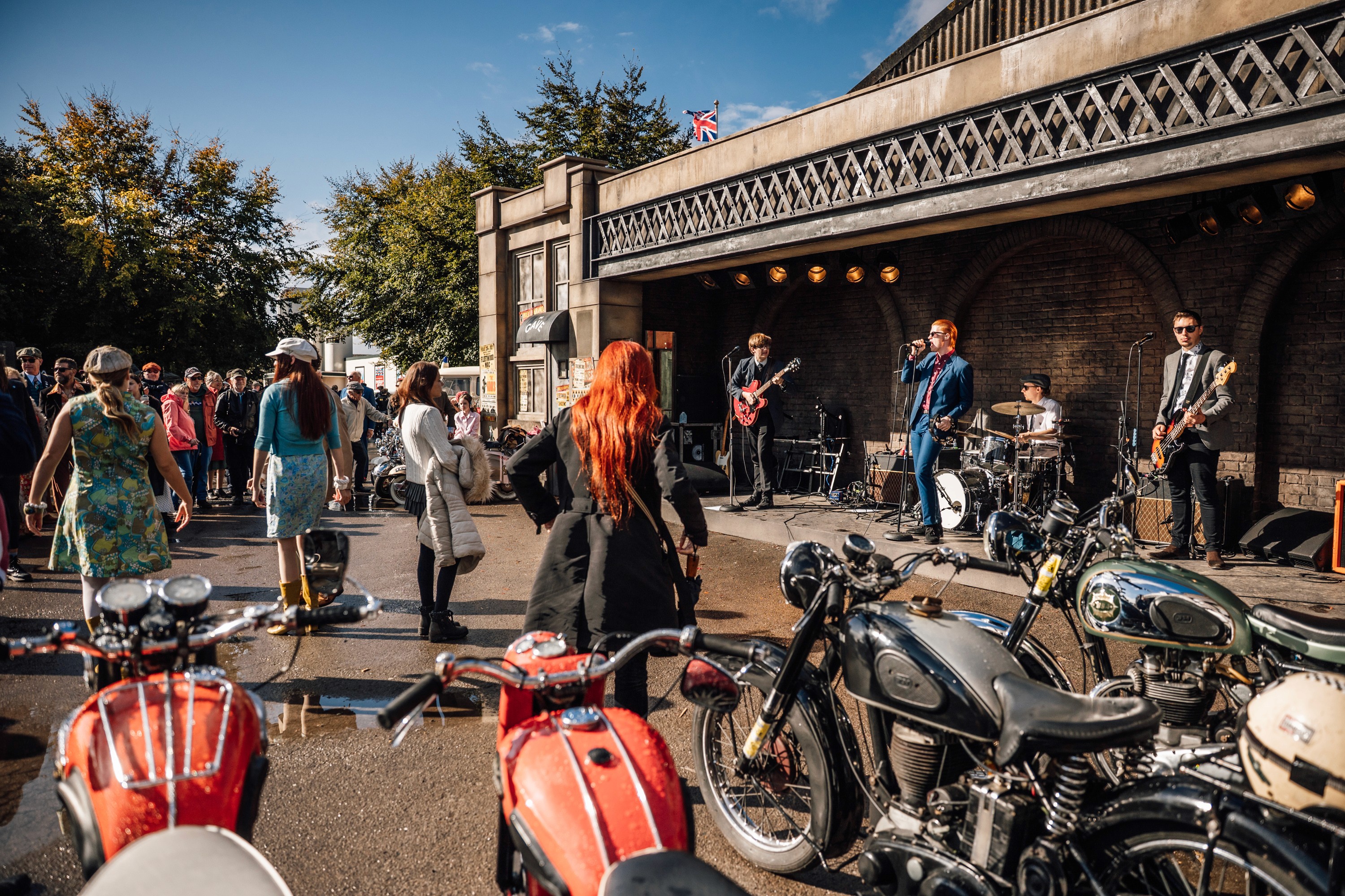 Temple Court at Goodwood Revival 2025 recreated the spirit of 1965 Liverpool, complete with a Cavern Club-style stage featuring live music performances. The installation celebrated the era of Mods and Rockers, showcasing classic motorcycles and Vespas alongside the period-authentic scenic environment.